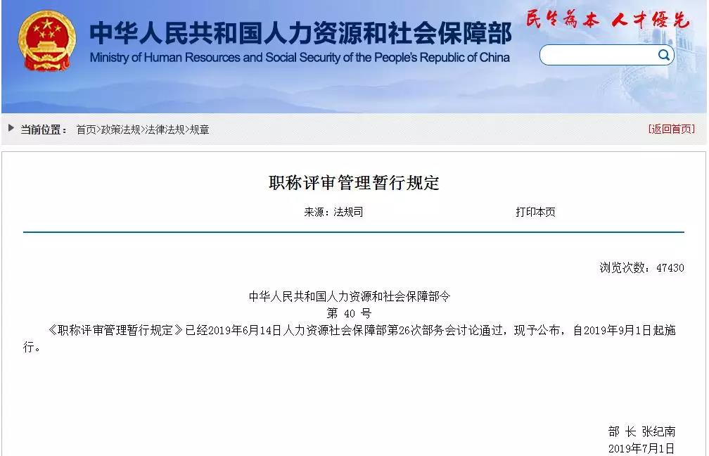 近日,人力资源和社会保障部官网发布《职称评审管理暂行规定》,该《规定》已经2019年6月14日人力资源社会保障部第26次部务会讨论通过,现予公布,自2019年9月1日起施行。