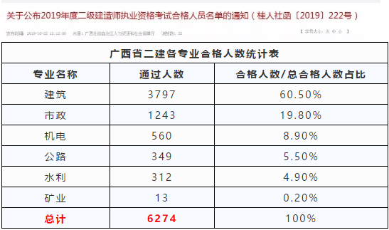 虽然目前各地二建合格人数暂未公布,但我们通过往年数据(此处以2019年广西数据数据为例)二建各个专业的合格人数/总报考人数占比,也能看出来二建各专业的热度情况。