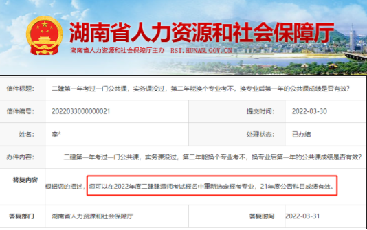 关于这类问题,每个地方的答案不统一,如青海省就在报考公告中明确表示“如果更改报考级别或报考专业,都将变为新考生,不保留通过科目的成绩”,而湖南省官方的回答却是“可以在2022年度二建建造师考试报名中重新选定报考专业,21年度公告科目成绩有效”。