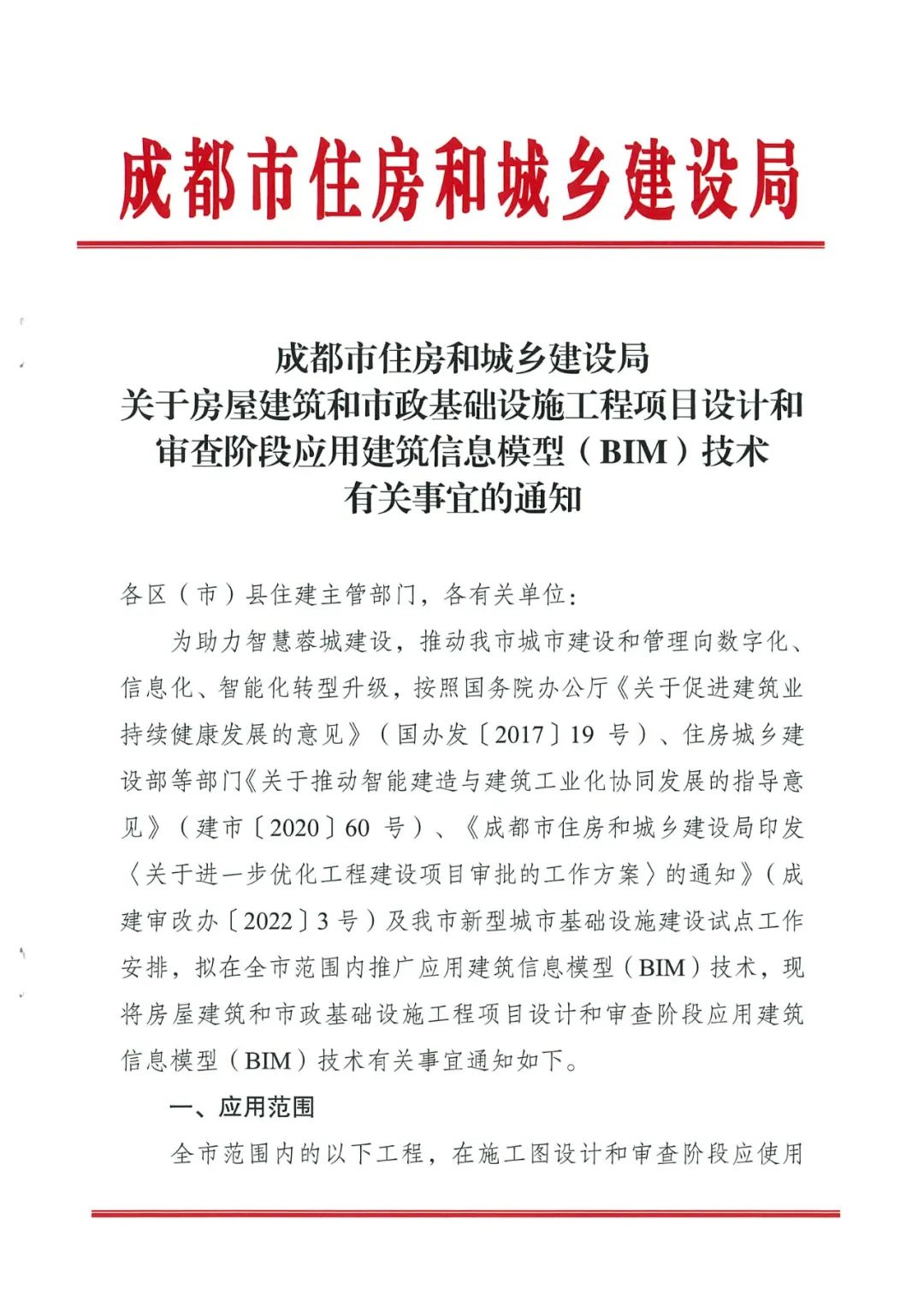 为助力智慧蓉城建设,推动我市城市建设和管理向数字化、信息化、智能化转型升级,按照国务院办公厅《关于促进建筑业持续健康发展的意见》(国办发〔2017〕19号)、住房城乡建设部等部门《关于推动智能建造与建筑工业化协同发展的指导意见》(建市〔2020〕60号)、《成都市住房和城乡建设局印发〈关于进一步优化工程建设项目审批的工作方案〉的通知》(成建审改办〔2022〕3号)及我市新型城市基础设施建设试点工作安排,拟在全市范围内推广应用建筑信息模型(BIM)技术,现将房屋建筑和市政基础设施工程项目设计和审查阶段应用建筑信息模型(BIM)技术有关事宜通知如下。