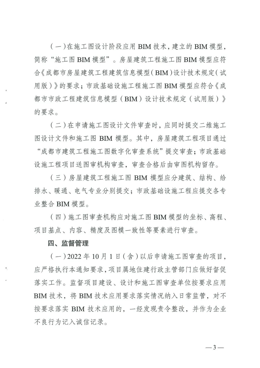 (二)在申请施工图设计文件审查时,应同时提交二维施工图设计文件和施工图BIM模型。其中,房屋建筑工程项目通过“成都市建筑工程施工图数字化审查系统”提交审查;市政基础设施工程项目送图审机构审查,审查合格后由审图机构留存。