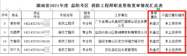 近期,岳阳、益阳、郴州、怀化、邵阳5市2021年一级消防工程师考后人工核查结果公布,部分考生因不符合报名条件、未报待审不予通过。