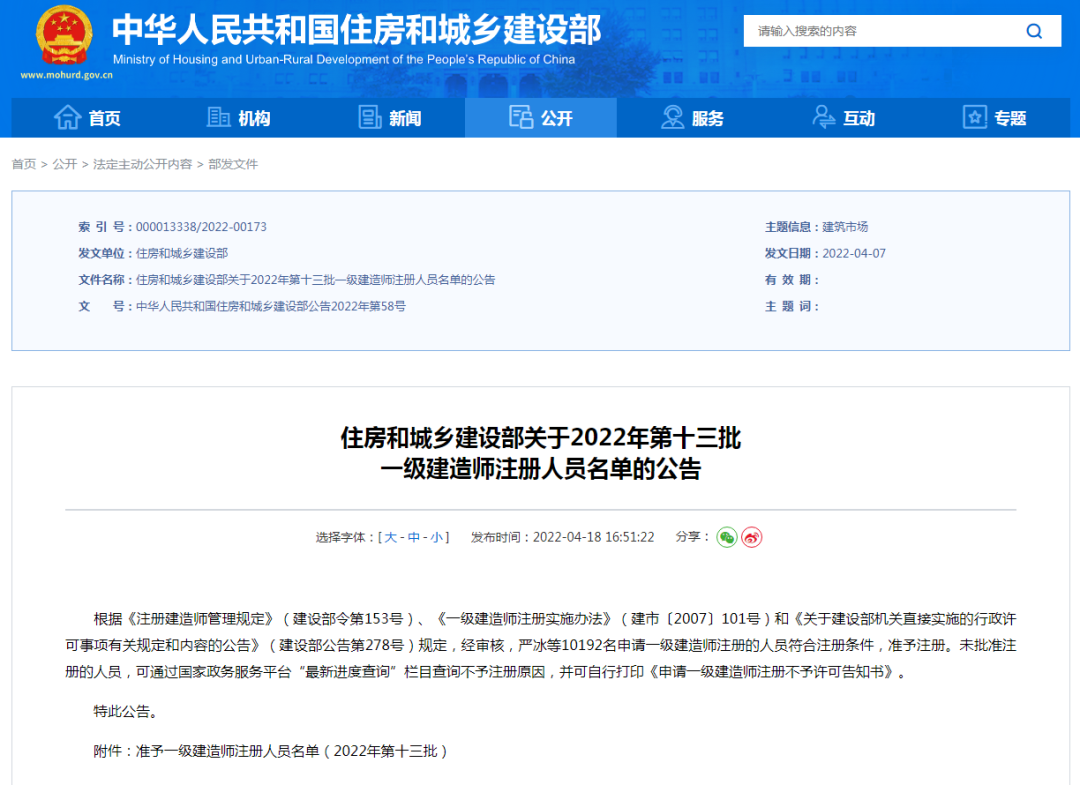 城乡建设部官网公布了:2022年第十三批一级建造师注册人员名单。10192人准予注册!一起来看!
