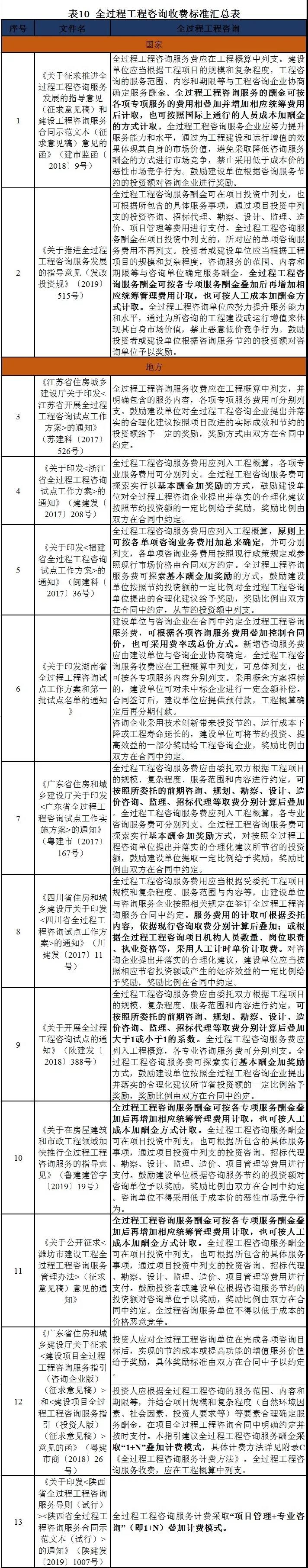 收费标准 目前国家层面尚未颁布详细、可操作的收费机制,缺乏成熟统一的规范性收费指导文件,全过程工程咨询服务收费标准主要包括两种:1、按各项专项服务的费用相叠加并增加相应统筹费用后计取,2、人员成本加酬金的方式计取,同时,鼓励建设单位根据咨询服务节约的投资额对咨询企业进行奖励。具体详见表10。