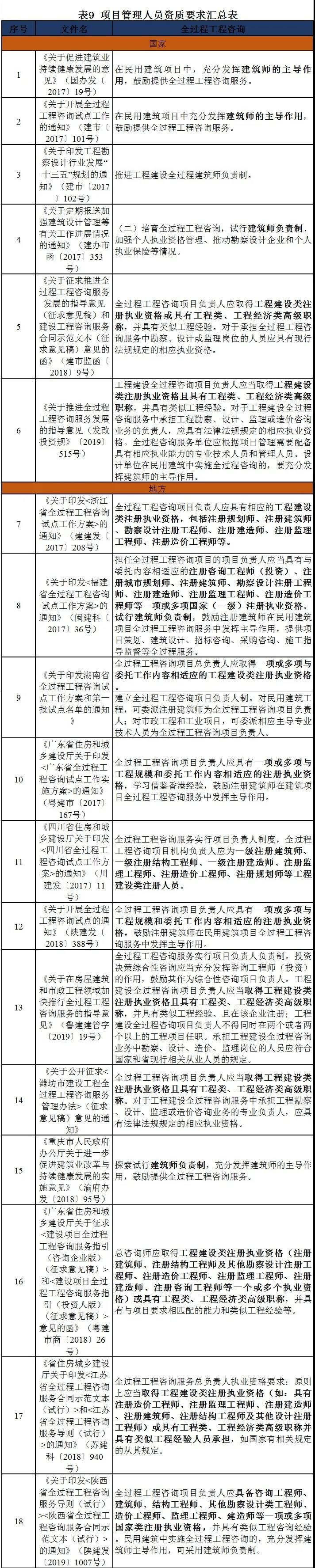 人员资质要求 国家及地方政策文件中大部分文件要求全过程工程咨询项目负责人应至少具备一项工程建设类注册执业资格(一级注册建造师、一级注册建筑师、注册造价师等),部分要求同时具有工程类、工程经济类高级职称,并且推进建筑师负责制。具体详见表9。