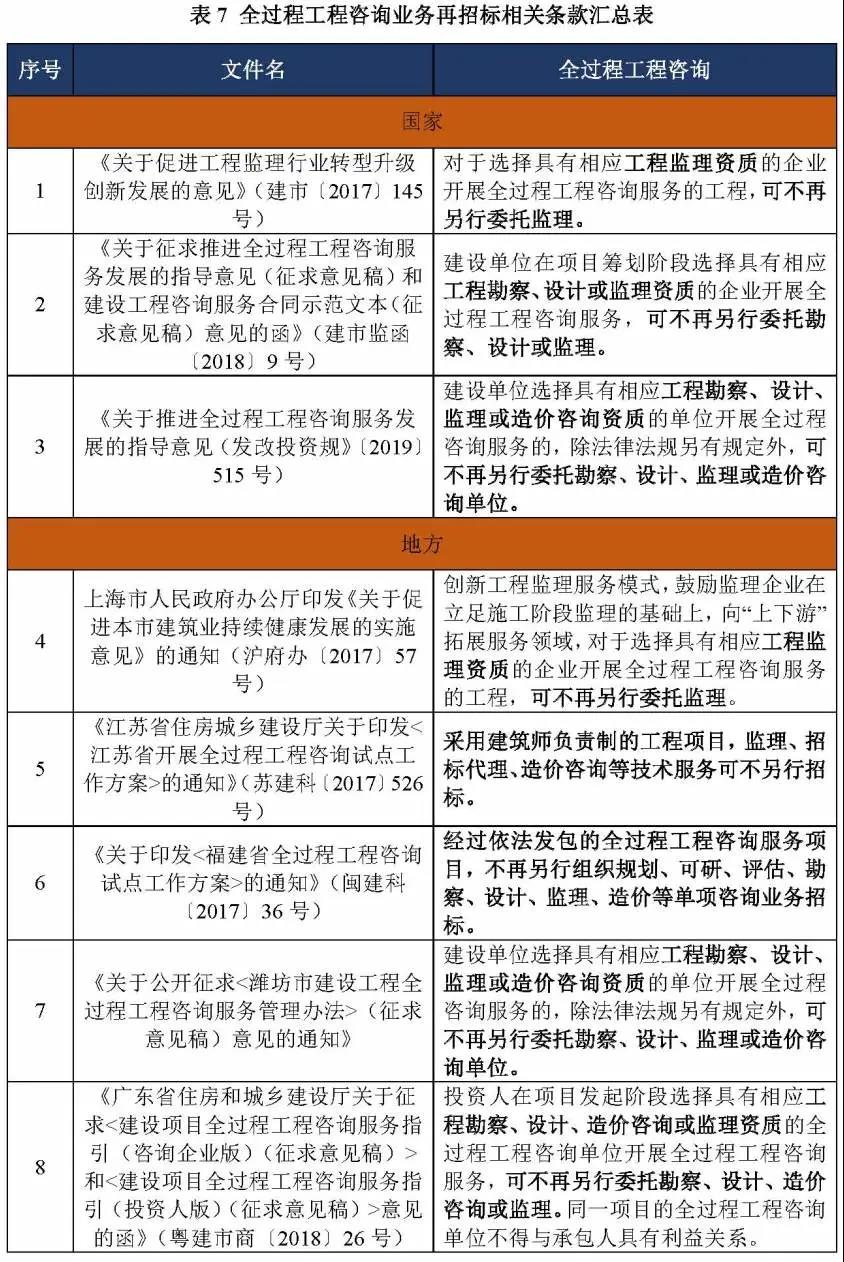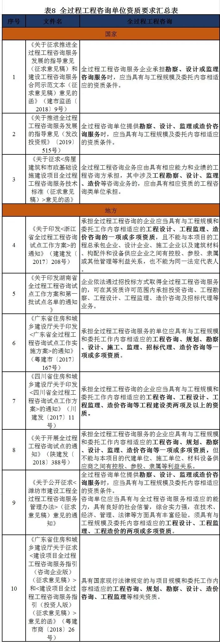 单位资质要求 目前,国家及地方政策文件中对于全过程工程咨询单位资质要求的规定有所不同,通常要求具备勘察、设计、监理、招标代理、造价咨询、工程咨询等工程建设类资质中的一项或者多项资质。具体详见表8。