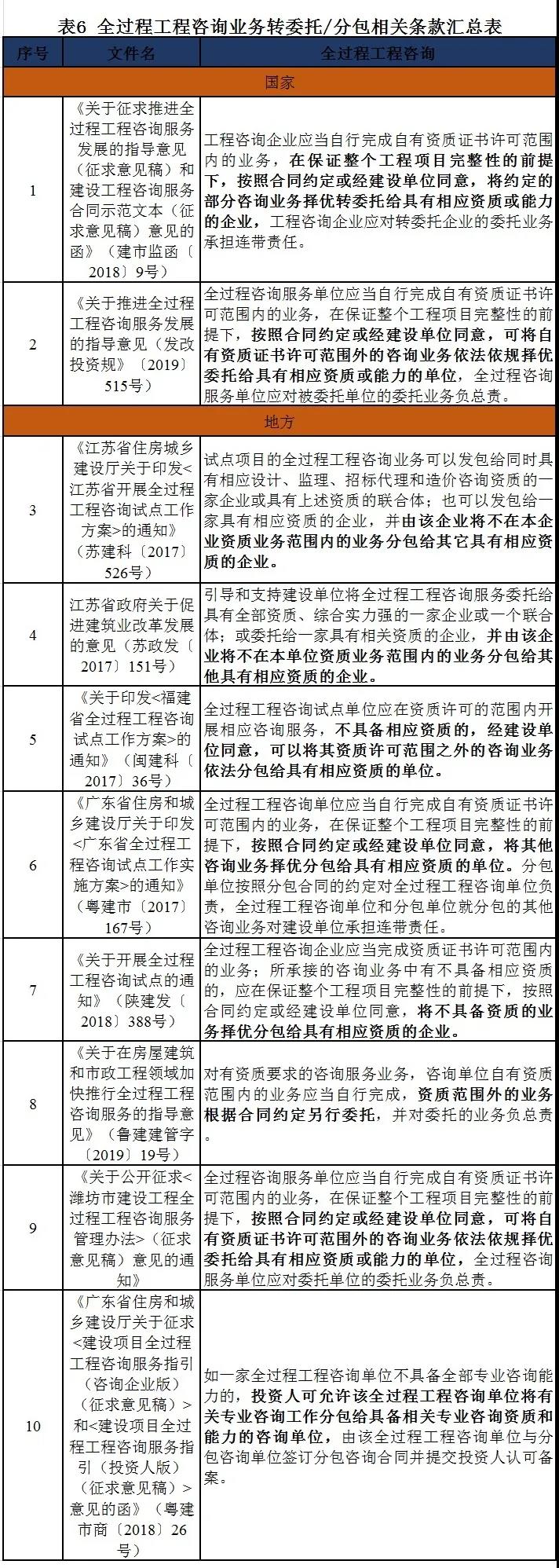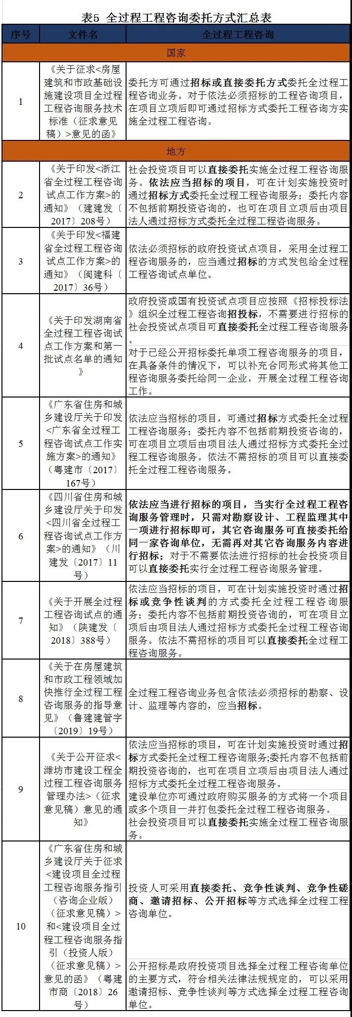 委托方式 全过程工程咨询委托方式仍处于探索阶段,国家已颁布的政策文件并未明确委托方式,但在《关于征求<房屋建筑和市政基础设施建设项目全过程工程咨询服务技术标准(征求意见稿)>意见的函》中及部分地方政策文件中明确了依法应当招标的项目,应通过招标方式委托全过程工程咨询服务,依法不需招标的项目可以直接委托全过程工程咨询服务,具体详见表5。同时,在保证整个工程项目完整性的前提下,按照合同约定或经建设单位同意,可将自有资质证书许可范围外的咨询业务依法依规择优转委托/分包给具有相应资质或能力的单位,具体详见表6。 对于依法必须招标的项目,全过程工程咨询所涉及的单项咨询业务是否必须招标,国家及地方相关文件规定:建设单位选择具有相应工程勘察、设计、监理或造价咨询资质的单位开展全过程咨询服务的,除法律法规另有规定外,可不再另行委托勘察、设计、监理或造价咨询单位。具体详见表7。