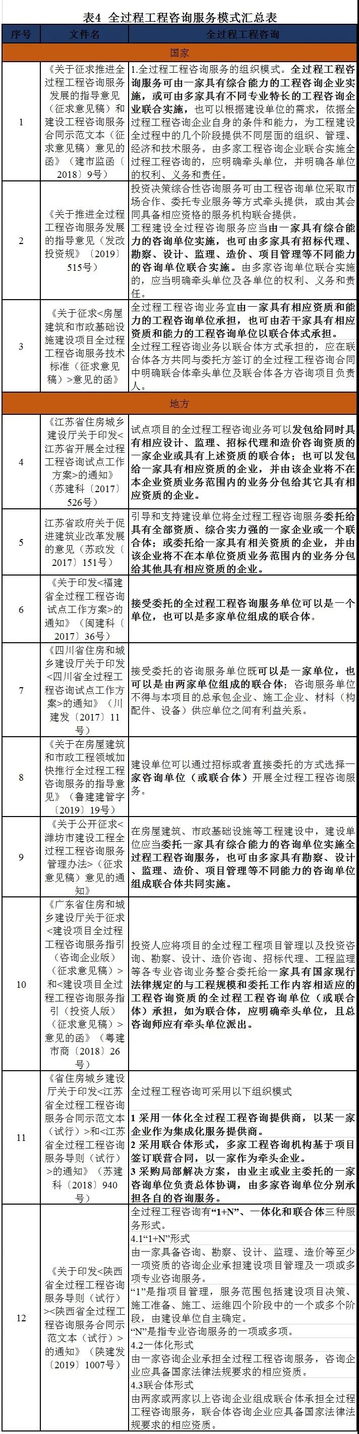 服务模式 目前全过程工程咨询服务模式主要有两种:1、由一家具有综合能力的咨询单位实施,2、由多家具有招标代理、勘察、设计、监理、造价、项目管理等不同能力的咨询单位联合实施。具体详见表4。