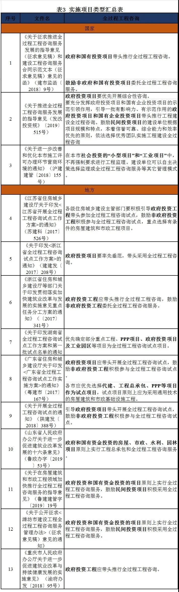 项目类型 现行国家及地方政策文件中适合采用全过程工程咨询的项目类型以政府投资项目为主,鼓励非政府投资项目委托全过程工程咨询服务,同时,部分地方文件推行以PPP项目及工业园区等项目作为试点项目。具体详见表3。