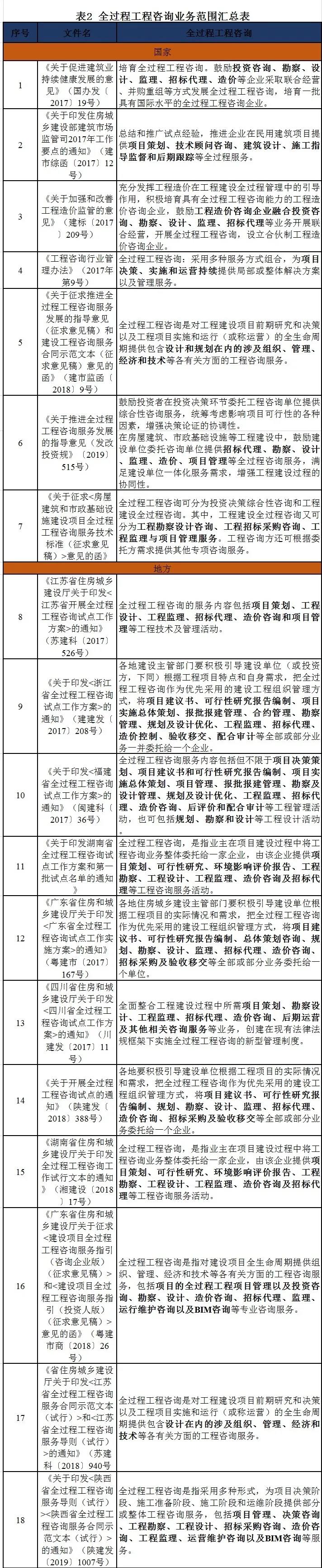 根据国家及地方政策文件关于全过程工程咨询的描述,全过程工程咨询服务是工程咨询的延伸,是指在项目投资决策、工程建设、运营管理过程中,为建设单位提供的涉及经济、技术、组织、管理等各有关方面的综合性、跨阶段、一体化的咨询服务。 业务范围 根据国家及地方政策文件,全过程工程咨询业务范围包含招标代理、勘察、设计、监理、造价、项目管理等服务内容,具体详见表2。