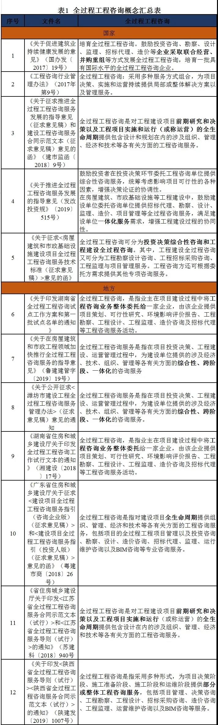 为深化工程领域咨询服务供给侧结构性改革,破解工程咨询市场存在的建设单位对综合性、跨阶段、一体化咨询服务的需求日益增长与现行制度造成的单项服务供给模式之间的供需矛盾,创新咨询服务组织实施方式,《国务院办公厅关于促进建筑业持续健康发展的意见》(国办发〔2017〕19号)提出“培育全过程工程咨询”。 2020年,部分地区陆续出台了一系列文件,积极培育和发展全过程工程咨询。 2020年3月,深圳市住建局发布《关于申报深圳市第一批全过程工程咨询试点企业的通知》,指出:深圳市勘察设计、工程监理、造价咨询等企业具有相应专业甲级资质,具有大型工程项目工程咨询服务业绩,可申请为全过程工程咨询试点企业。 2020年8月,湖南省住建厅发布《关于推进全过程工程咨询发展的实施意见》。提出,2021年,政府投资、国有资金投资新建项目全面采用全过程工程咨询,社会投资新建项目逐步采用全过程工程咨询;2025年,新建项目采用全过程工程咨询的比例达到70%以上,全过程工程咨询成为前期工作的主流模式。 2020年8月,陕西省住建厅和发改委联合印发《关于在房屋建筑和市政基础设施工程领域加快推进全过程工程咨询服务发展的实施意见》,鼓励开展创新咨询服务模式;加快培育具备“全牌照全资质”的咨询企业;政府投资项目率先开展咨询服务;完善项目委托方式;提升项目管理水平;完善服务计费方式;优化服务市场环境。 2020年10月。广西省住建厅印发《广西壮族自治区房屋建筑和市政基础设施全过程工程咨询服务招标文件范本(2020年版)》。 2020年11月,黑龙江省住建厅发布征求《黑龙江省全过程工程咨询导则》修改意见的函,对全过程工程咨询的服务阶段、业务范围、服务形式、责任义务等进行明确规定。 2020年12月,深圳市住建局印发《推进全过程工程咨询服务发展的实施意见》(征求意见稿)、《深圳市全过程工程咨询服务导则》(征求意见稿)、《深圳市全过程工程咨询服务招标文件示范文本》(征求意见稿)、《深圳市全过程工程咨询服务合同示范文本》(征求意见稿)。 2020年12月,济南市住建局印发《济南市房屋建筑和市政基础设施项目工程总承包管理办法(征求意见稿)》,明确工程总承包项目原则上同步推行全过程工程咨询服务。 2020年12月,湖南省住建厅发布《湖南省房屋建筑和市政基础设施项目全过程工程咨询招标投标管理暂行办法》,规范全过程工程咨询招标投标活动,明确指出:政府投资、国有资金投资新建项目应当采用全过程工程咨询模式,服务内容原则上包含工程勘察、工程设计、工程监理、造价咨询、项目管理五项咨询服务。全过程工程咨询招标投标工作鼓励采用电子化交易方式。全过程工程咨询服务评标办法原则上采用综合评估法。评审的主要因素包括资信业绩、服务团队、全过程工程咨询工作大纲、设计方案、投标报价等。全过程工程咨询项目负责人应当由投标人单位或联合体牵头单位派出,取得工程建设类注册执业资格且具有工程类或工程经济类高级职称,同时具有类似工程经验。该办法于2021年2月1日起施行,为期两年。 全过程工程咨询政策文件在全过程工程咨询推广过程中具有重要的调控和指导作用,下面从国家及各地方政府(以试点城市为主)网站查找并汇总了50余份全过程工程咨询相关政策文件,最终整理出35份已发布政策文件及4份征求意见稿,以全过程工程咨询的定义界定、业务范围、项目类型、服务模式、委托方式、单位资质要求、人员资质要求和收费标准等为切入点,梳理相关条款,为开展全过程工程咨询服务提供参考。 定义界定 国家及地方政府部门颁布的全过程工程咨询相关政策文件及征求意见稿,对全过程工程咨询的概念做出了描述,但尚未完全统一,主要概念梳理如下表所示: